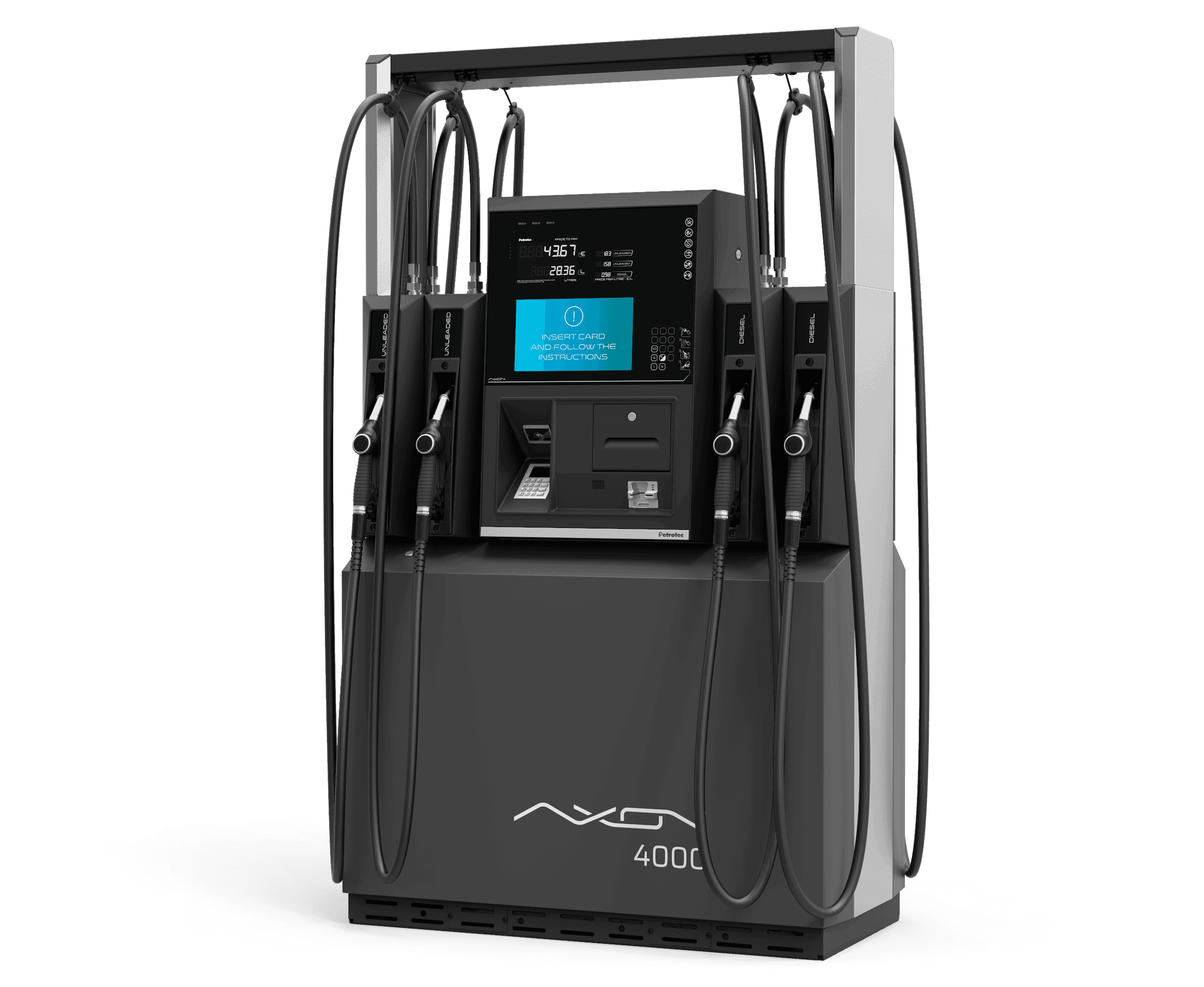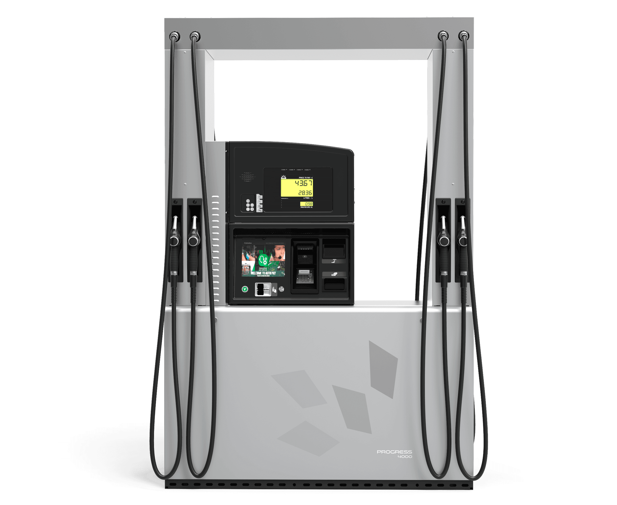 El surtidor A4000 tiene dos posibles formatos en H, en función de la configuración de la estación de servicio y del número de mangueras seleccionadas. Es la elección adecuada para quienes buscan funciones completas y múltiples configuraciones, al tiempo que ahorran espacio.